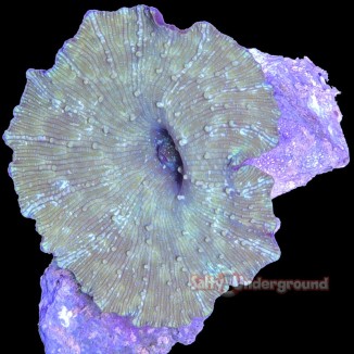 The Neon Green Toadstool is a type of "Leather" coral considered to be one of the easiest to keep corals in the hobby. Leather corals are distinguished by the fleshy or leathery skin developed by the coral to hold its polyps in place. Most leather corals will develop erratic and unique shapes as they grow outward in multiple directions, but the Toadstool leather typically creates a large tower shape that is 2-3 times bigger at the top than the bottom giving this coral its namesake "toadstool" nickname. The green polyps will become more pronounced under higher light, but it is not necessary to keep this coral in high light conditions. Leathers generally are adaptive to many different conditions including multiple flow/lighting and will be tolerant of a wide variety of water parameters. We consider the Green Toadstool to be an excellent beginner coral.
